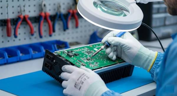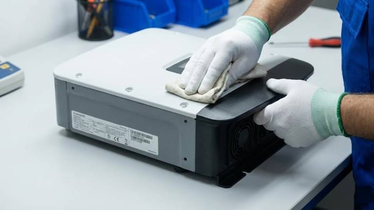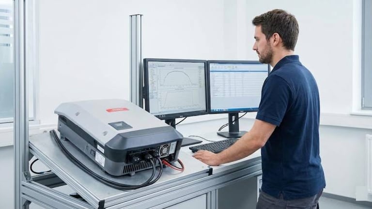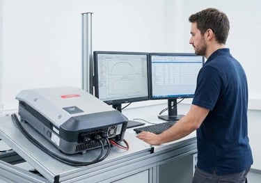 Não entregamos no "achismo". Utilizamos simuladores de painéis solares e carga resistiva em nossa bancada para testar o desempenho máximo do seu inversor e garantir que ele volte a gerar energia com eficiência.